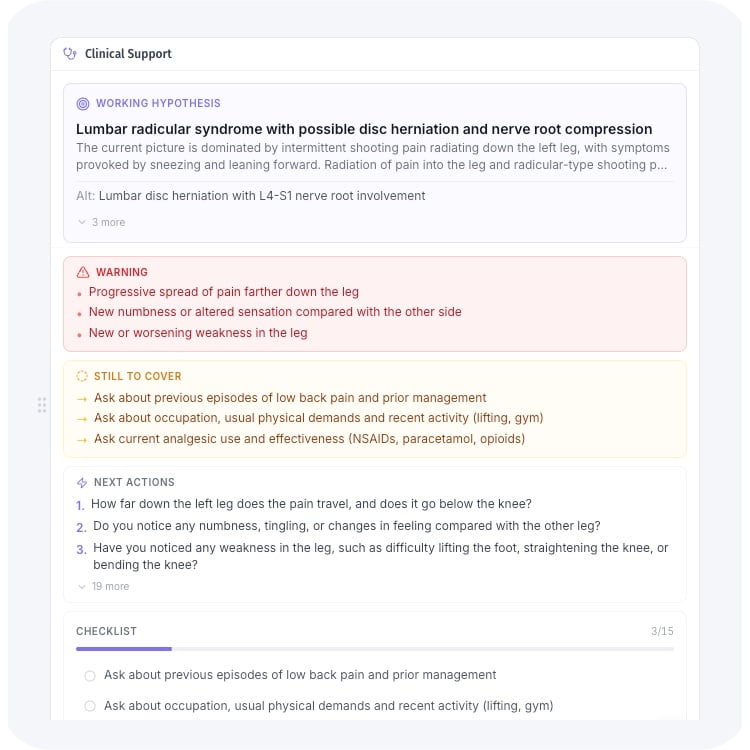 See possible diagnoses, key differentiators, and what to test next, based on your conversation.